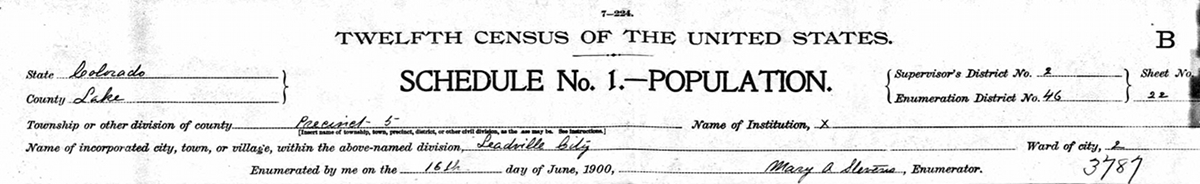 | Daughter | She was enumerated on the census on 16 June 1900 in the household of Thomas Carroll Walker, Sr., as a daughter, in Leadville, Lake County, Colorado, USAG. Enumerated in the household with Tom (age 50) were his wife Mary Hawkins (age 40), sons Robert Walton (age 16) & Gavin Leslie (age 5), and daughters Virginia Belle (age 14) and Mary Ann (age 12). His occupation was entered as "Mining". Robert was a "miner". Virginia and Mary were "at school".6![]() 1900 US Census, header for page listing household of Thomas Carroll Walker Sr., in Leadville, Lake County, Colorado. ![]() 1900 US Census, Leadville, Lake County, Colorado. Household of Thomas Carroll Walker Sr., his wife Mary Hawkins, children Robert Walton, Virginia Belle, Mary Ann and Gavin Leslie. |