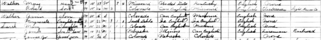 | Daughter | Mary Ann Walker was enumerated on the census on 11 April 1910 in the household of Mary Martha Hawkins, as a daughter, in Leadville, Lake County, Colorado, USAG. Enumerated in the household with Mary were her son Robert, his wife Margaret/Marguerite (McPike), Mary's son Gavin (single), daughter Mary, her husband James Larsh along with their son James Larsh Jr. Robert's occupation was electrician with the Light & Power Company. James Larsh was a fireman with the railroad.7![]() 1910 US Census, Mary (Hawkins) Walker, widow, head of household. Leadville, Colorado. |
