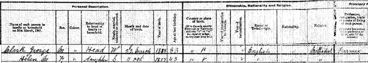 | Witness | She was enumerated on the census on 18 April 1901 in the household of George Clark in Lot 25, Prince County, Prince Edward Island, CanadaG. included in the household with George (age 83) was his daughter Helen (age 43). George was a farmer. They were Methodists.3 1901 Canada Census, Lot 25, Prince County, Prince Edward Island. Household of widowed George Clark and his daughter Helen. |