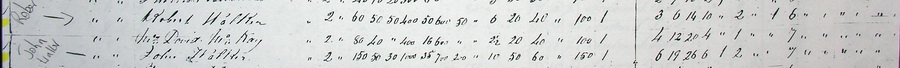 | Son | He was enumerated on the census in 1861 in the household of Robert Walker, as a son, in Lot 19, New Annan, Prince County, Prince Edward Island, 46.41978, -63.70972G. Robert was listed as a farmer and a member of the Presbyterian Church of the Lower Provinces. The proprietor was Andrew T. Todd, with 30 years expired on a lease of 999 years. Land was leased at the rate of £1 per acre per year. Of the 100 acres, 60 were arable and of 2nd quality. In the year up to the 1861 census they grew 50 bushels of wheat, 50 bushels of barley, 400 bushels of oats, 50 bushels of buckwheat, 600 bushels of potatoes, 50 bushels of turnips and 6 tons of hay. They weaved 20 yards of fulled cloth, 40 yards of non-fulled cloth and made 100 lbs. of butter. They owned 3 horses, 6 cattle, 14 sheep and 10 hogs. In the household were two people born in Scotland (Robert and Betsy), 1 in the British provinces (Ann Bramble), and 6 born on P.E.I. By age, there was 1 male under 5 (George Price), 2 females and 1 male between 5 and 16 (Jessie, Elizabeth, Isabella and Thomas - should be 3 females), 1 female between 16 & 20 (Mary), 1 male between 21 & 45 (David), 1 female and 1 male between 45 & 60 (Betsy and Robert), and 1 female over 60 (Ann Bramble). Ann B. was already married in 1855. William James had died in 1856. Margaret H. was already married in 1859.2 ![]() 1861 Canada Census, showing entries for brothers Robert and John Walker, New Annan, Prince Edward Island. |
