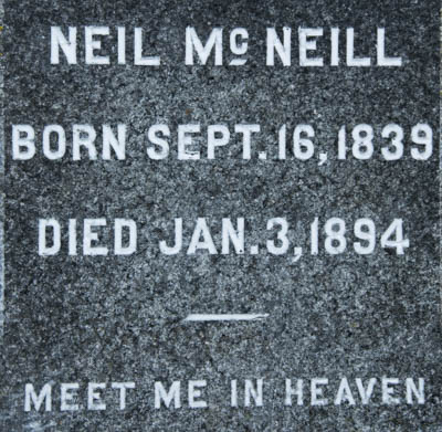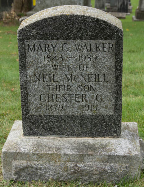 | Burial | He was buried in the Protestant Cemetery, Danville, Québec, Canada, 45.77729, -72.01894G. Inscription: Mary C. Walker / 1843 - 1939 / Wife of / Neil McNeill / Their Son / Chester C. 1879 - 1915Back: Neil McNeill / Born Sept. 16, 1839 / Died Jan. 3, 1894 / Meet Me in Heaven.6 ![]() Tombstone, Mary Cairns Walker (1843-1939), her husband Neil McNeill (1839-1894), their son Chester (1879-1915). Protestant Cemetery, Danville, Québec, Canada. ![]() Back inscription. |