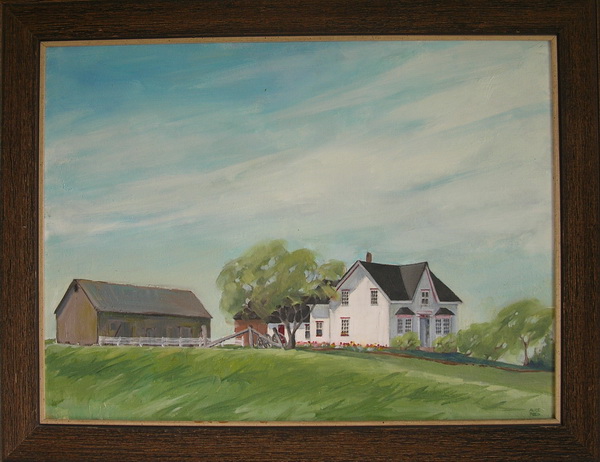 | Marriage | He married Marjorie Agnes Blacklock daughter of Thomas Andrew Blacklock and Millicent May Clark, on 31 December 1924, in the home of the bride's parents, Enstone Green Farm, Little Shemogue, Westmorland County, New Brunswick, Canada, 46.116510, -64.023376G. they were married by license #2894. Walter was a bachelor, farmer, 35 years old, Presbyterian, living in Little Shemogue. Agnes was a spinster, housekeeper, 28 years old, Presbyterian, living in Little Shemogue.5 Enstone Green Farm, the Blacklock homestead in Little Shemogue, New Brunswick. Painting by Alice Reed. |