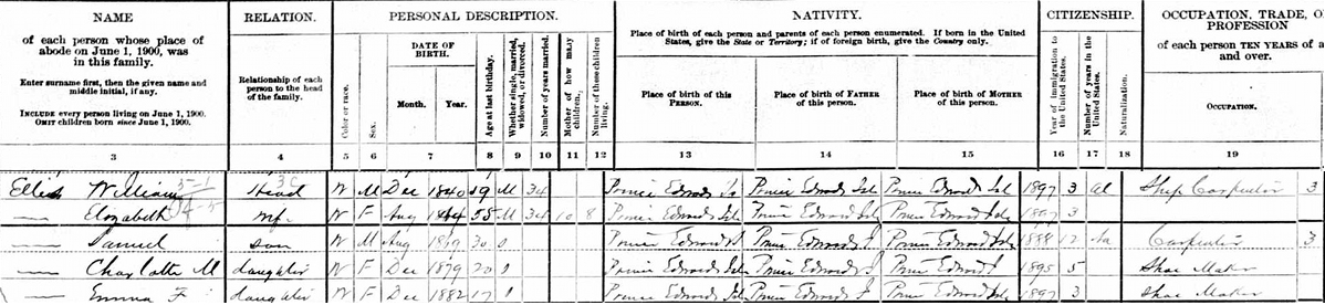 - [S3559] 1881 Canada Census, Summerside, Prince County, Prince Edward Island, household #162 James Sharpe, 4 April 1881, digital copy of original document, LAC Microfilm C-13162, Page 37. Library & Archives Canada, Library & Archives Canada; 395 Wellington St., Ottawa,, Ontario, Canada.