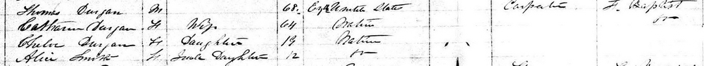 | Witness | She was enumerated on the census in 1861 in the household of Thomas Durgan, Esq., in Hampstead, Queens County, New Brunswick, CanadaG. included in the household were his wife, Catherine (Gerow),, daughter Sheloah (Cheloe) and Alice Smith. Her relationship to Thomas is not known, but the entry in the census appears to be 'Grand Daughter'.1 1861 census, Hampstead, Queens County, New Brunswick. Household of Thomas Durgan. Included in the household were his wife, Catherine (Gerow),, daughter Sheloah (Cheloe) and Alice Smith. |