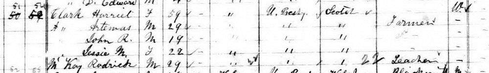 | Witness | He was enumerated on the census on 4 April 1881 in the household of Harriet Hooper in Lot 25, Prince County, Prince Edward Island, CanadaG. listed in the household with Harriet were her sons Artemas and John R., and daughter Jessie M.1 1881 Canada Census, Harriet (Hooper) Clark, head of household. Listed with her were her sons Artemas & John R., and daughter Jessie M. Rodrick McKay, a boarder, teacher, was also listed. |