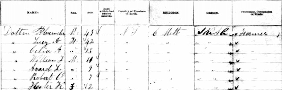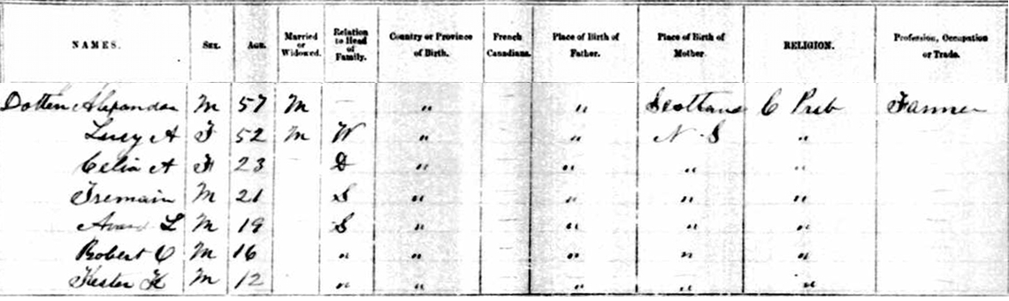 | Witness | William Tremaine Dotten was enumerated on the census in 1881 in the household of Alexander Dotten included in the household with Alexander (age 43) were his wife Lucy (age 42), daughter Celia (age 13), sons William (age 11), Avard (age 9), Robert (age 7) and Nester (age 2). The only occupation recorded was that of Alexander, farmer. The family religion was Methodist. The origin column for Alexander has 'Irish' recorded, which is incorrect.3 1881 Canada Census, Wallace, Cumberland County, Nov Scotia. Household of Alexander Dotten, his wife Lucy Ann Purdy and 5 children. |