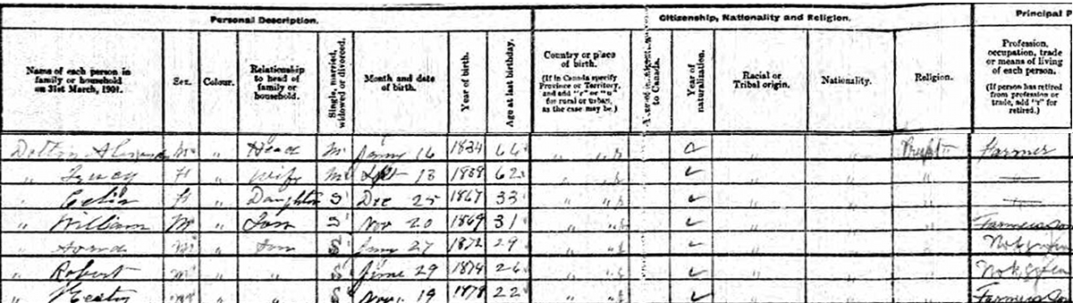 | Witness | William Tremaine Dotten was enumerated on the census on 3 May 1901 in the household of Alexander Dotten in Wallace, Cumberland County, Nova Scotia, CanadaG. included in the household with Alexander (age 66), were his wife Lucy (age 62), children Celia (age 33), William (age 31), Avard (age 29), Robert (age 26) and Kester (?, age 22). Alexander was a farmer, as were William & Kester. Occupations for Avard and Robert were entered as "not given", however, total earnings for Avard were $190 and $800 for Robert, "working on own account". The family religion was Presbyterian.5 1901 Canada Census, Wallace, Cumberland County, Nova Scotia. Household of Alexander Dotten, his wife Lucy Ann Purdy, and their 5 adult children. |
