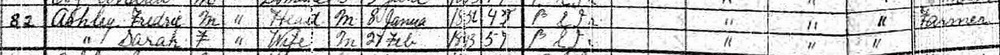 | Census | Frederick Bruce Ashley was head of the household in the census on 6 April 1891 in Alberton, Prince County, Prince Edward Island, CanadaG. included in the household of Frederick B. were his wife Sarah (Stapley Wallace), her daughter Laura (by previous marriage to Frederick's brother John), and James M. Miller, entered as an adopted son. Frederick was a farmer. The family religion was Methodist. This household was next to Frederick's father.4 1891 Canada Census, household of Freerick B., his wife Sarah (Stapley Wallace), daughter Laura, and James M. Miller, entered as an adopted son. Alberton, Prince County, Prince Edward Island, Canada. |
