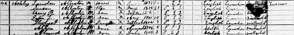 | Census | He was head of the household in the census on 4 April 1881 in Alberton, Prince County, Prince Edward Island, CanadaG. included in the household were John's wife Elizabeth, son John B., daughter-in-law Sarah (Stapley Wallace), grandchildren Elizabeth Ann, Lowden (Lowdin) & Laura Bell, and adopted daughter Martha. William Omarah, a 22 year old Irishman, was a farm labourer. John's occupation was entered as farmer. Methodist was entered as the religion of John, his wife Elizabeth, son John B. and adopted daughter Martha. John's daughter-in-law and three grandchildren were entered as Church of England.2 1881 Canada Census, household of John & Elizabeth Ashley, Alberton, Prince County, Prince Edward Island, Canada. |