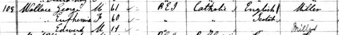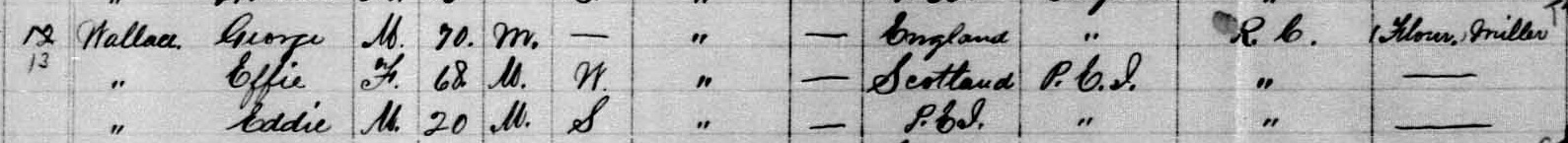 | Witness | He was enumerated on the census in 1861 in the household of George Gued Wallace in Lot 18, Indian River, Prince County, Prince Edward IslandG. included in the household with George (males 21-65 = 1) were his wife Euphemia (females 21-65 = 1), children Catherine (females 6-21 = 1), John Edward (males 6-21 = 4), George (males 6-21 = 4), William (males 6-21 = 4), Henry (males 6-21 = 4), Mary Adelaide (females under 6 = 2). Joanna (females under 6 = 2) and Thomas Joseph (males under 6 = 1). George was a miller. The family religion was Roman Catholic.3 1861 Canada Census, Lot 18, Indian River, Prince County, Prince Edward Island. Household of George Gued Wallace, his wife Euphemia (McLellan) and 8 children. |