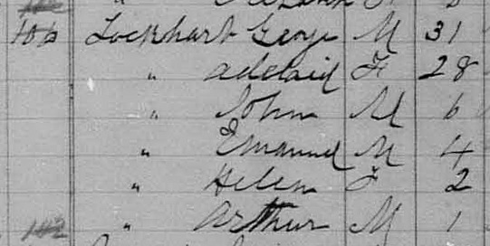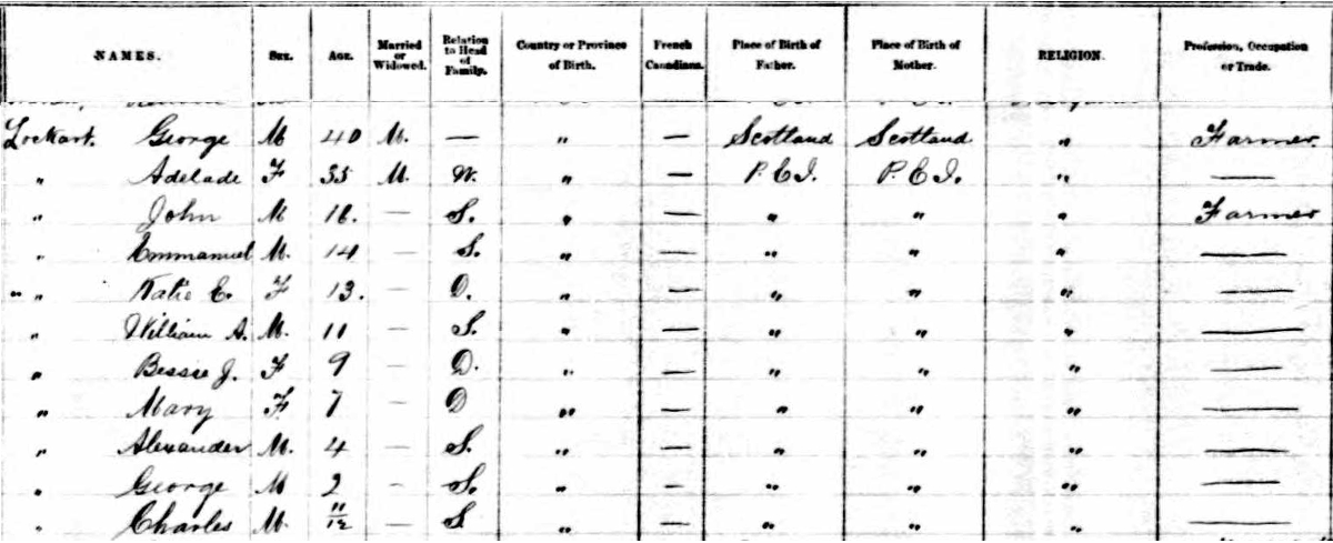 | Witness | He was enumerated on the census on 4 April 1881 in the household of George R. Lockhart in Lot 18, Prince County, Prince Edward Island, CanadaG. included in the household were his wife Adelaide (Wallace), sons John, Emmanuel, & Arthur, and daughter Helen. The family religion was Presbyterian. George was a farmer.2 1881 Canada Census, Lot 18, Prince County, Prince Edward Island. Household of George Lockhart. Included in the household were his wife Adelaide (Wallace), sons John, Emmanuel, & Arthur, and daughter Helen. The family religion was Presbyterian. George was a farmer. |