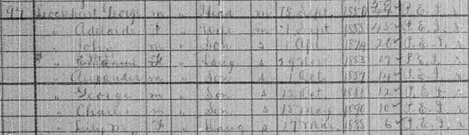 | Witness | George Leo Wallace was enumerated on the census on 1 June 1911 in the household of George Wallace in Alma, Prince County, Prince Edward Island, CanadaG. included in the household were George's wife Catherine (O'Connor), mother-in-law Mary, daughters Bernice, Annie, Clara & Margaret, sons John, George, Albert & William. There was also Edward Keefe, a 67 year old domestic.4 1911 Canada Census, Lot 3, Alma, Prince County, Prince Edward Island. Household of George & Catherine (O'Connor) Wallace. Included in the household were George's wife Catherine (O'Connor), sons John, George, Albert & William, daughters Bernice, Annie, Clara & Margaret, and mother-in-law Mary O'Connor. |