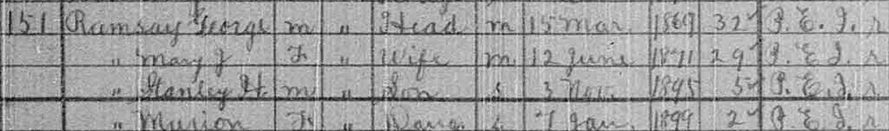 | Witness | Stanley Huston Ramsay was enumerated on the census on 1 June 1911 in the household of George Sinclair Ramsay in Lot 18, Prince County, Prince Edward Island, CanadaG. included in the household were George's wife Mary (Bryanton), son Stanley, daughters Marion & Ella, and George's mother Catherine (Wallace). The family religion was Presbyterian. George was a farmer.3 1911 Canada Census, Lot 18, Prince County, Prince Edward Island. Household of George Ramsay. Included in the household were George's wife Mary (Bryanton), son Stanley, daughters Marion & Ella, and George's mother Catherine (Wallace). The family religion was Presbyterian. George was a farmer. |
