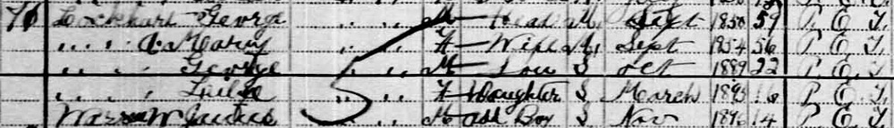 | Witness | George Lockhart was enumerated on the census on 31 March 1901 in the household of George R. Lockhart in Lot 18, Prince County, Prince Edward Island, CanadaG. included in the household were George's wife Adelaide (Wallace), sons John, Alexander, George & Charles, and daughters Mary & Lily. The family religion was Presbyterian. George was a farmer. This family did not appear in the 1891 census.1 1901 Canada Census, Lot 18, Prince County, Prince Edward Island. Household of George & Adelaide (Wallace) Lockhart. Included in the household were George's wife Adelaide (Wallace), sons John, Alexander, George & Charles, and daughters Mary & Lily. The family religion was Presbyterian. George was a farmer. |