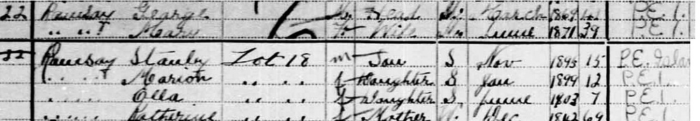 | Witness | He was enumerated on the census on 31 March 1901 in the household of George Sinclair Ramsay in Lot 18, Prince County, Prince Edward Island, CanadaG. included in the household were his wife Mary (Bryanton), son Stanley and daughter Marion. The family religion was Presbyterian. George was a farmer.2 1901 Canada Census, Lot 18, Prince County, Prince Edward Island. Household of George Ramsay. Included in the household were his wife Mary (Bryanton), son Stanley and daughter Marion. The family religion was Presbyterian. George was a farmer. |