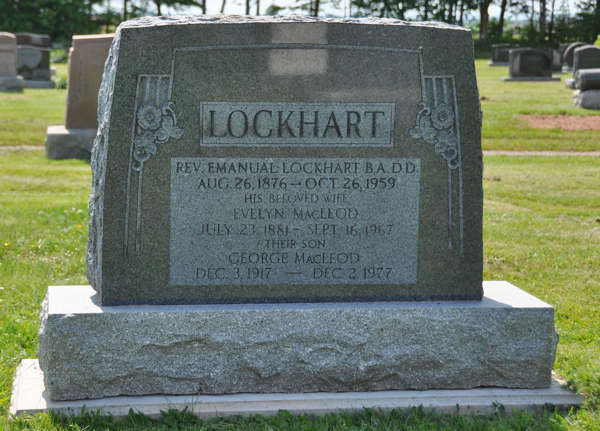 | Burial | He was buried in the Peoples Cemetery, Kensington, Prince County, Prince Edward Island, Canada, 46.44783, -63.62904G. inscription: LOCKHART / George Lockhart / October 12, 1888 - August 6, 1951 / His Wife / Catherine E. Martin / September 24, 1904 - June 4, 2004 / I have fought a good fight, I have finished / my course, I have kept the faith.6,7 Tombstone, George Lockhart and his wife, Catherine E. Martin. The Peoples Cemetery, Kensington, Prince County, Prince Edward island. |