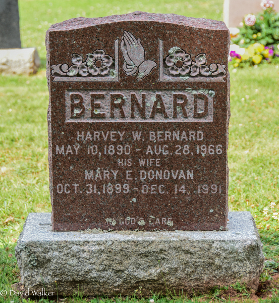 Inscription: BERNARD / Harvey W. Bernard / May 10, 1890 - Aug. 28, 1966 / His Wife / Mary E. Donovan / Oct. 31, 1899 - Dec. 14, 1991 / In God's Care.3,4  Cemetery marker, Harvey W. Bernard (1890-1966), his wife Mary E. Donovan (1899-1991). Peoples Cemetery, Summerside, Prince County, Prince Edward Island, Canada.