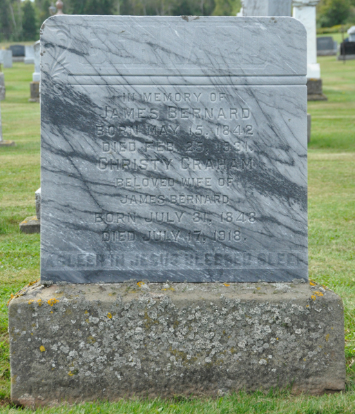 Inscription: In Memory of / James Bernard / Born May 15, 1842 / Died Feb. 25, 1931. / Christy Graham / Beloved Wife of / James Bernard / Born July 31, 1848 / Died July 17, 1918. / Asleep in Jesus Blessed Sleep.8  Tombstone, James Bernard (1842-1931), his wife Christy Graham (1848-1918). Geddie Memorial Cemetery, Springbrook, Queens County, Prince Edward Island, Canada.