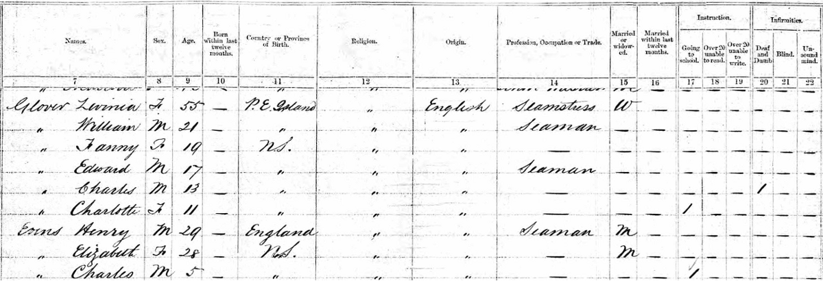 | Census | James Glover was head of the household in the census in 1861 in Pictou, Pictou County, Nova ScotiaG. this census doesn't provide as much detail as more recent returns. However, it does show James as head of the household with 6 males (I have only 4 in my file) and 4 females. There is 1 female birth recorded "since 30th March 1860", which would be Charlotte.2 1861 Canada Census, Pictou, Nova Scotia. Household of James Glover, his wife Lavinia Cannon, their children Elizabeth, William, Fanny, Edward, Charles and Charlotte. The census record shows 6 males living in the household, whereas I have only 4 in my file. |