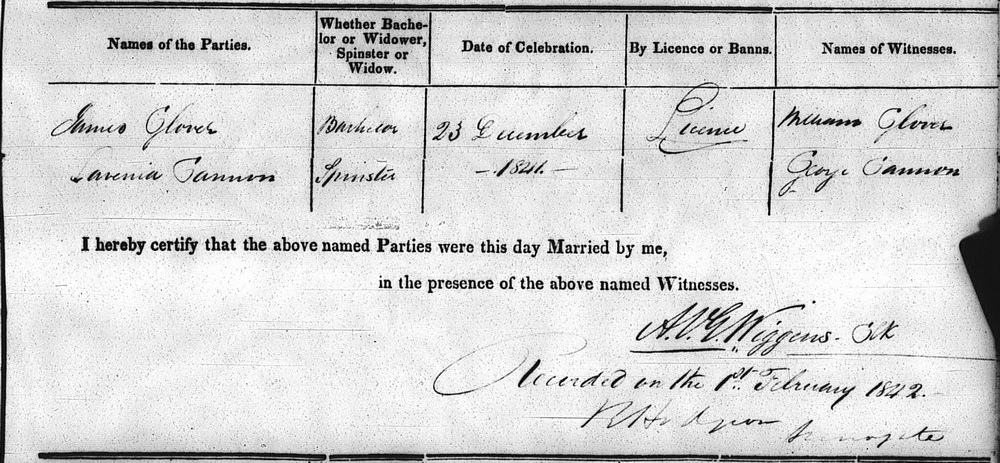 | Marriage | James Glover married Lavinia Cannon daughter of George Cannon and Elizabeth Hiscock, on 23 December 1841, in St. John's Anglican Church, St. Eleanors, Prince County, Prince Edward Island, 46.419983, -63.811033G. "James Glover (B) Lot 19 and Lavenia Cannon (S) of St. Eleanors, were married by license this 23rd Decr. 1841. In presence of William Glover, George Cannon." James was a tailor.1 Marriage Record, James Glover & Lavinia Cannon, 1841. |