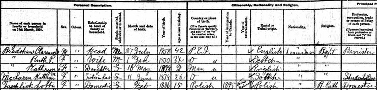| Census | Clarence Wilton Bradshaw was head of the household in the census in 1901 in Winnipeg, Manitoba, CanadaG. included in the household with Clarence (age 42) were his wife Ruth (age 31), their daughter Kathryn (age 2), his sister Kathryn (age 26), and Lotty Taschlick (age 15), a servant. Clarence was a barrister. Kathryn was a business student. The family religion was Baptist.2 1901 Canada Census, Winnipeg, Manitoba. Household of Clarence Bradshaw, his wife Ruth, their daughter Kathryn, and his sister Kathryn. |