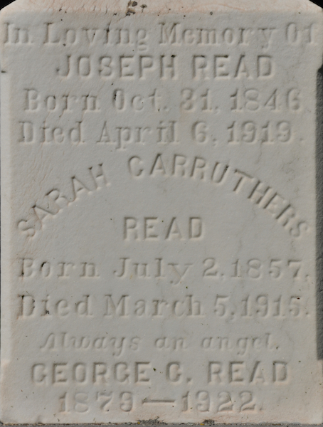 - [S6257] Cemetery Marker - Joseph Read. Joseph Read & Sarah Carruthers, Cemetery Marker; David A. Walker, 18 August 2011.