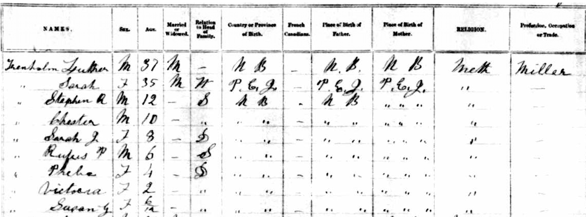 | Witness | She was enumerated on the census in 1861 in the household of Robert Trenholm in Botsford Parish, Westmorland County, New BrunswickG. included in the household with Robert (age 36) were his wife Sarah Allen (age 38), and their children Lucinda (age 14), Matthew Albert (age 13), Melissa Jane (age 11), Mary Emeline (age 9), Herman Luther (age 7), Hannah Rebecca (age 5) and John Snowball (age 2). Robert was a farmer. The family religion was Methodist.1 1861 Canada East Census, Botsford, Westmorland County, New Brunswick. Household of Robert Trenholm, his wife Sarah Allen, children Lucinda, Matthew Albert, Melissa Jane, Mary Emeline, Herman Luther, Hannah Rebecca and John Snowball. |