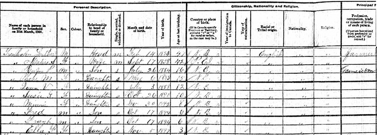 - [S18043] 1901 Canada Federal Census for Botsford Parish, Westmorland, New Brunswick, household 103 of Isaac Trenholm, digital copy of original census document, Page 11. Library & Archives Canada, Library & Archives Canada; 395 Wellington St., Ottawa,, Ontario, Canada.