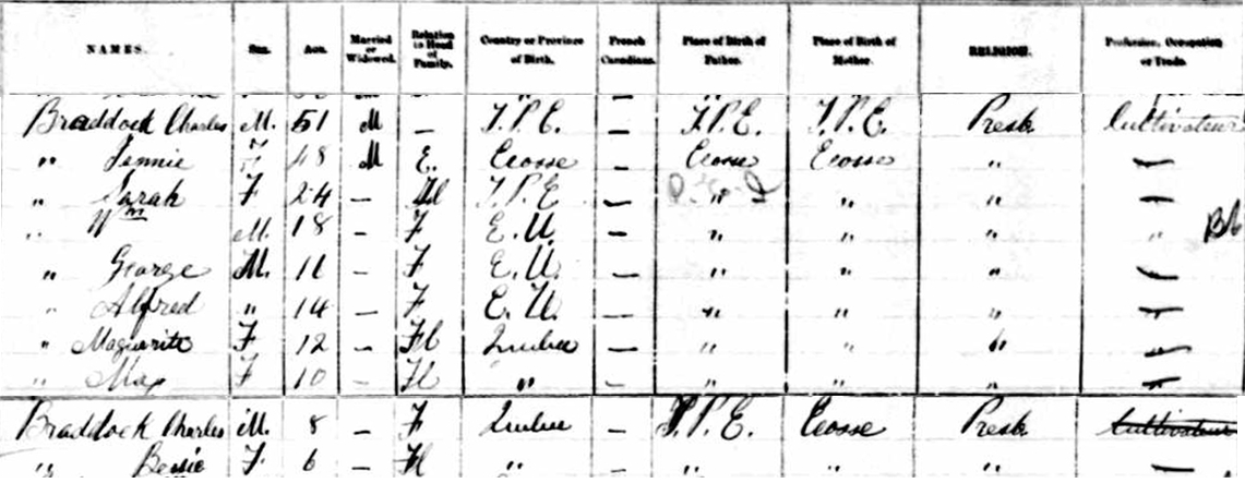 - [S7026] 1901 digital image from microfilm, Library & Archives Canada; 395 Wellington St., Ottawa,, Ontario, Canada, Lot 4, Prince County, Prince Edward Island, Library & Archives Canada Page 4, Family No. 34, George Currie.