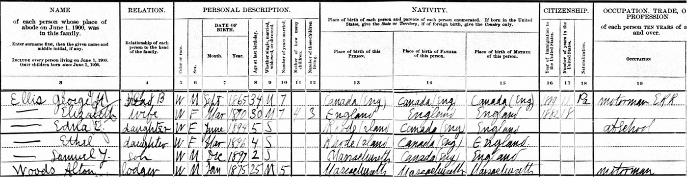 | Witness | He was enumerated on the census on 7 June 1900 in the household of George Milton Ellis in Somerville, Middlesex County, Massachusetts, USAG. included in the household with George (age 34) were his wife Elizabeth Green (age 30), their children Edna (age 5), Ethel (age 4) and Samuel (age 2). They declared that there were four children during their marriage, of whom three were living in 1900. George's occupation was recorded as "motorman ERR". There was also in the household an unrelated lodger, Alton Woods, also a motorman.2 1900 US Census, Somerville, Middlesex County, Massachusetts. Household of George M. Ellis, his wife Elizabeth Green, their children, Edna, Ethel and Samuel, and an unrelated lodger, Alton Woods. |
