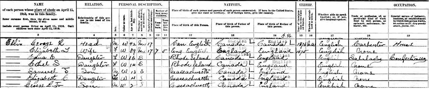 | Witness | Samuel J. Ellis was enumerated on the census on 31 May 1910 in the household of George Milton Ellis in Watertown, Middlesex County, Massachusetts, USAG. included in the household with George (age 42) were his wife Elizabeth Green (age 39), their children Edna (age 16), Ethel (age 14), Samuel (age 12), Elizabeth (age 4) and George (age 2). They declared that there were seven children during their marriage, of whom five were living in 1910. George's occupation was recorded as a house carpenter, Edna a saleslady in a confectionary store.3 1910 US Census, Watertown, Middlesex County, Massachusetts. Household of George M. Ellis, his wife Elizabeth Green, their children, Edna, Ethel, Samuel, Elizabeth and George. |