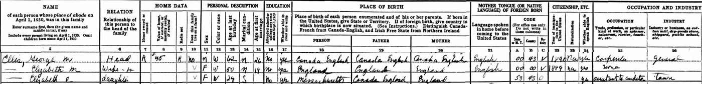 - [S7002] 1900 US Census, Somerville, Middlesex County, Massachusetts, household #230, George M. Ellis, 7 June 1900, digital image of census page, Roll 666, Page 10B, Family History Library microfilm 1240666. Library & Archives Canada, Library & Archives Canada; 395 Wellington St., Ottawa,, Ontario, Canada.