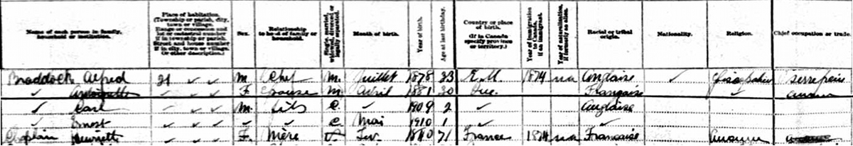 | Witness | He was enumerated on the census in 1911 in the household of John Frederick Braddock in Farnham, County of Lake Megantic, Québec, CanadaG. included in the household with Alfred (age 33) were his wife, Antoinette Chapelain (age 30), their sons, Carl (age 2) and Ernest (age 1) and Antoinette's widowed mother, Henriette (age 71).1 1911 Canada Census, Farnham, Lake Megantic, Québec. Household of Alfred Braddock, his wife Antoinette, their sons Carl and Ernest, and Antoinette's widowed mother, Henriette Hoplain. |