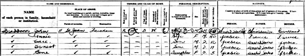 | Witness | She was enumerated on the census in 1921 in the household of John Frederick Braddock in 11 St. Jean, Farnham, Missisquoi, Québec, CanadaG. included in the household with John (age 44) were his wife Annie Chapelain (age 40), their children Carl (age 12), Ernest (age 11) and Gene (age 5). John was an engineer. The family religion was Presbyterian. His immigration year was incorrectly recorded as 1883.3 1921 Canada Census, Farnham, Missisquoi, Québec. Household of John Braddock, his wife Annie Chapelain, their children Carl, Ernest and Gene. |