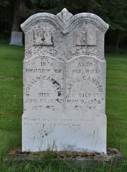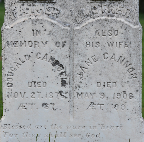 | Burial | He was buried in Presbyterian Church "Old" Cemetery, Tyne Valley, Prince County, Prince Edward Island, Canada, 46.57383, -63.93078G. "old" cemetery, section E, stone #58. Tablet.Inscription: Father / In / Memory of / Dougald Campbell / Died / Nov. 27, 1876. / AET. 67 | Mother / Also / His Wife / Jane Cannon / Died / May 9, 1906 / AET. 88 // Blessed are the pure in heart / For they shall see God.1,2 Tombstone, Dougald Campbell (1809-1876) and Jane Cannon (1813-1906), Presbyterian Church "Old" Cemetery, Tyne Valley, Prince County, Prince Edward Island, Canada.  Inscription detail. |