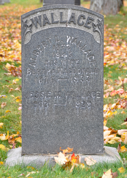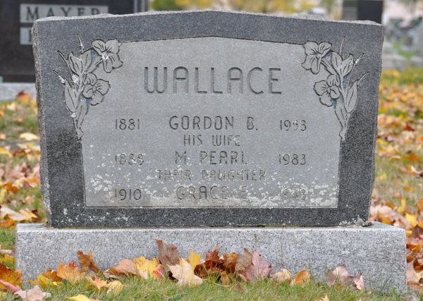Section B. Inscription: WALLACE / 1881 Gordon B. 1953 / His Wife / 1888 M. Pearl 1983 / Their Daughter / 1910 Grace E. 1943.4,5  Tombstone, Gordon Baxter Wallace (1880-1953), his wife Minnie Pearl Brown (1888-1983), their daughter Edna Grace (1910-1943). Elmwood Cemetery, Moncton, Westmorland County, New Brunswick, Canada.