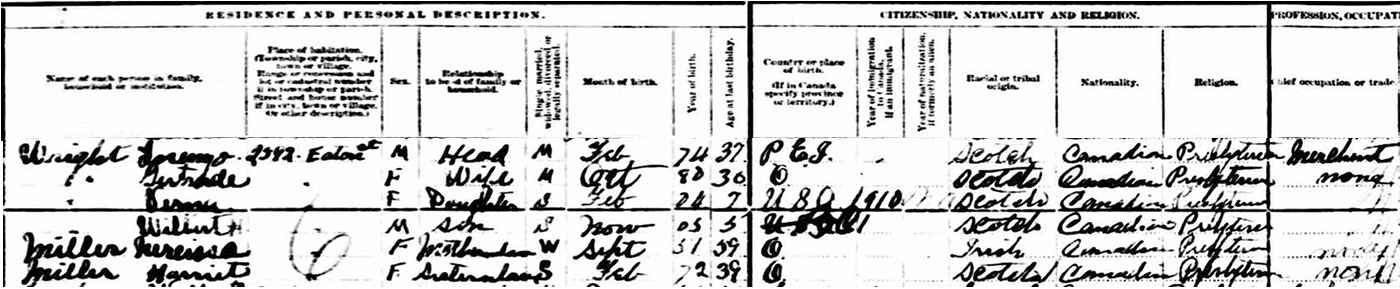 | Witness | He was enumerated on the census on 16 June 1911 in the household of Lorenzo Duncan Wright in 2582 Eaton St., New Westminster, British Columbia, CanadaG. included in the household of Lorenzo (age 37) were his wife Gertrude Miller (age 30), their children Verna (age 7) and Wilbert (age 5), Gertrude's single sister Harriet (age 39) and widowed mother Minerva/Anne (age 59). Lorenzo was a merchant. The family religion was Presbyterian.5 1911 Canada Census, New Westminster, British Columbia. Household of Lorenzo Wright, his wife Gertrude Miller, their children Verna and Wilbert, Gertrude's sister Harriet and mother Minerva. |