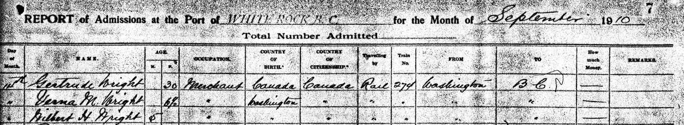 | Witness | Verna May Wright witnessed the immigration of Gertrude May Miller on 14 September 1910 in British Columbia, CanadaG.3 Border crossing record, Gertrude May (Miller) Wright and her two children, Verna May and Wilbert Hamlet. |