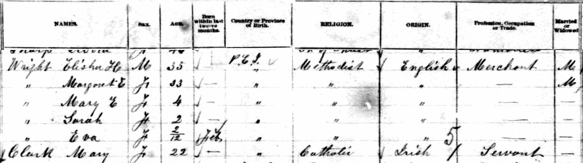 | Census | Elisha Hooper Wright was head of the household in the census in April 1881 in Summerside, Prince County, Prince Edward Island, CanadaG. included in the household with Elisha (age 35) were his wife Margaret Clark (age 33), their children Mary (age 4), Sarah (age 2) and Eva (age 2 months), and Mary Clark (age 22), an unrelated servant. Elisha was a merchant. The family religion was Methodist.4 1881 Canada Census, Summerside, Prince County, Prince Edward Island. Household of Elisha Hooper Wright, his wife Margaret Elizabeth Clark, their children Mary, Sarah & Eva, and an unrelated servant. |