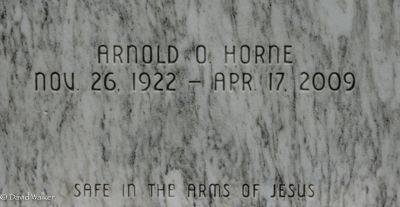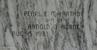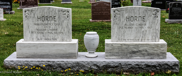 Inscription Left Marker: HORNE / Ruby Florence Gay / Wife of / Allison G. Horne / Oct. 7, 1901 - Aug. 30, 1975 / Alive Forever More Back: Pearl. E. MacArthur / Wife of / Arnold O. Horne / Aug. 15, 1933 -Inscription Right Marker:HORNE Allison G. Horne / Dec. 16, 1901 - Nov. 1, 1967 / It is Far Better to be with ChristBack: Arnold O. Horne / Nov. 26, 1922 - Apr. 17, 2009 / Safe in the Arms of Jesus.2  Tombstone, Allison G. Horne (1901-1967), his wife Ruby Florence Gay (1901-1975), their son Arnold O. Horne (1922-2009), his wife Pearl E. MacArthur (1933- ). Peoples Cemetery, Summerside, Prince County, Prince Edward Island, Canada.  Back of Allison's marker inscription detail.  Back of Ruby's marker inscription detail.