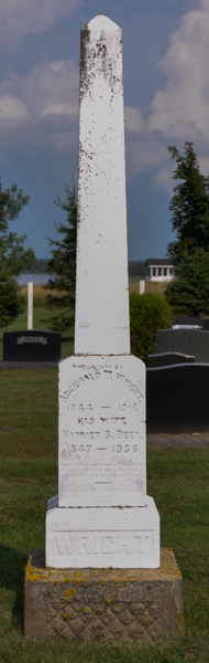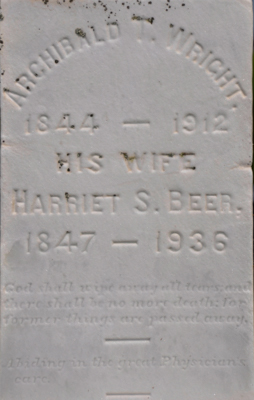 | Burial | He was buried in Bedeque Cemetery, Lower Bedeque, Prince County, Prince Edward Island, Canada, 46.34711, -63.73360G. Section C, Row 4, Stone 44Inscription: Archibald T. Wright / 1844 - 1912 / His Wife / Harriet S. Beer / 1847 - 1936 / God shall wipe away all tears, and / there shall be no more death: for / former things are passed away. / - / Abiding in the great Physician's / care.Left: Alfred Beer, / 1872 - 1886 / James Walter, / 1873 - 1900 / He giveth His beloved sleep.Right: Rebecca Jane / 1874 - 1875 / John Beer / 1876 - 1877 / Suffer little children to come / unto Me.3,4 Tombstone, Archibald Wright (1844-1912), his wife Harriet Beer (1847-1936), their children Alfred Beer (1872-1886), James Walter (1873-1900), Rebecca Jane (1874-1875), John Beer (1876-1877). Bedeque Cemetery, Lower Bedeque, Prince County, Prince Edward Island, Canada.  Front inscription detail.  Left inscription detail.  Right inscription detail. |