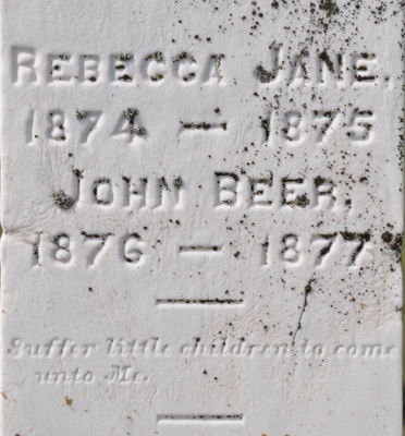| Burial | She was buried in Bedeque Cemetery, Lower Bedeque, Prince County, Prince Edward Island, Canada, 46.34711, -63.73360G. Section C, Row 4, Stone 44Inscription: First Marker: Rebecca Jane / died Sept. 23, 1875. / Aged 1 year / Also infant son / died Jan. 13, 1876 / Aged 14 days / Children of Archibald / & Harriet Wright / text below ground. ("infant son" is actually John Beer Wright, who also appears on the family tombstone.)Inscription Family Marker: Archibald T. Wright / 1844 - 1912 / His Wife / Harriet S. Beer / 1847 - 1936 / God shall wipe away all tears, and / there shall be no more death: for / former things are passed away. / - / Abiding in the great Physician's / care.Left: Alfred Beer, / 1872 - 1886 / James Walter, / 1873 - 1900 / He giveth His beloved sleep.Right: Rebecca Jane / 1874 - 1875 / John Beer / 1876 - 1877 / Suffer little children to come / unto Me.1,3,4 Tombstone, Rebecca Jane (1874-1875), infant son (1875-1876). Bedeque Cemetery, Lower Bedeque, Prince County, Prince Edward Island, Canada.  Tombstone, Archibald Wright (1844-1912), his wife Harriet Beer (1847-1936), their children Alfred Beer (1872-1886), James Walter (1873-1900), Rebecca Jane (1874-1875), John Beer (1876-1877). Bedeque Cemetery, Lower Bedeque, Prince County, Prince Edward Island, Canada.  Front inscription detail.  Left inscription detail.  Right inscription detail. |