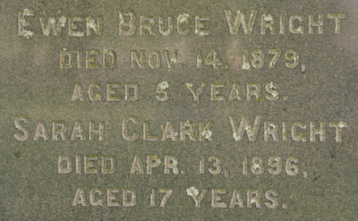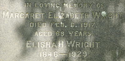 Inscription: In Loving Memory of / Margaret Elizabeth Wright / Died Feb. 6, 1917, / Aged 68 years. / Elisha H. Wright / 1846 - 1929 / WRIGHT Left: Ewen Bruce Wright / Died Nov. 14, 1879 / Aged 5 years / Sarah Clark Wright / Died Apr. 13, 1896 / Aged 17 years / WRIGHT.6,7  Tombstone, Elisha Hooper Wright (1846-1929), his wife Margaret Elizabeth Clark (1849-1917), their children Ewen Bruce Wright (1874-1879) and Sarah Clark Wright (1879-1896). Peoples Cemetery, Summerside, Prince County, Prince Edward Island, Canada.  Front inscription detail.  Left inscription detail.