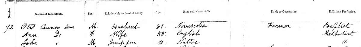 | Witness | Ann was enumerated on the census in 1851 in the household of Otis Cannon, Sr., in Harvey, Albert County, New BrunswickG. included in the household with Otis Sr. (age 71) were his second wife Ann (age 48), children, by his first marriage, Mariner (age 29), Paulina (age 21), Otis Jr. (age 17), Amanda (age 23), and Amanda's son John Tingley (age 3 weeks). The identity and whereabouts of the baby's father are not known. No occupation was recorded for Otis Sr. Mariner was a farmer.1 1851 Census of Canada, Harvey, Albert County, New Brunswick. Household of Otis Cannon Sr., his second wife Ann, his children, by his first marriage, Mariner, Paulina, Otis Jr. & Amanda, and Amanda's son John Tingley. |