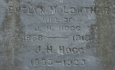 Section D, Row 1, Stone 51.Inscription: Evelyn M. Lowther / Wife of / J. H. Hogg / 1888 - 1919 / J. H. Hogg / 1883 - 1923 / HOGGBack: Barbara Stewart / Wife of / Herbert Hogg / 1850 - 1917.1  Tombstone, Peoples Cemetery, Kensington, Prince County, Prince Edward Island, Canada. James Herbert Hogg (1883-1923), his first wife Barbara Stewart (1850-1917), his second wife, Evelyn Lowther (1888-1919).  Front inscription.  Back inscription.