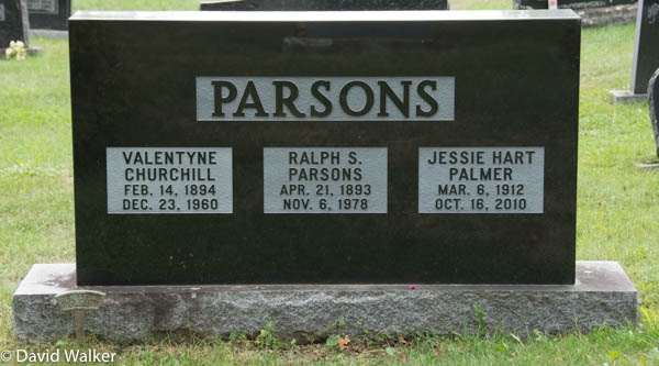 Inscription: PARSONS / Valentyne / Churchill / Feb. 14, 1894 / Dec. 23, 1960 | Ralph S. / Parsons / Apr. 21, 1893 / Nov. 6, 1978 | Jessie Hart / Palmer / Mar. 6, 1912 / Oct. 16, 2010.1  Tombstone, Ralph S. Parsons (1893-1978), his first wife Valentyne Churchill (1894-1960), his second wife Jessie (Hart) Palmer (1912-2010). Maplewood Cemetery, Windsor, Hants County, Nova Scotia, Canada.