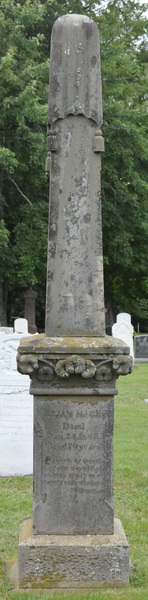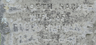 | Burial | She was buried in St. John's Anglican Church Cemetery, St. Eleanors, Prince County, Prince Edward Island, Canada, 46.41988, -63.81010G. Inscription:William Hacker / Died / Jan. 23, 1886 / Aged 79 yearsLeft: Jane Millman / Wife of / William Hacker / Died / Jan. 2, 1891 / ÆT. 79 yrs.Right: Elizabeth Hacker / Wife of / Ruben Pridham / 1847 - 1941.1 Tombstone, William Hacker (1807-1886), his wife Jane Millman (1812-1891), their daughter Elizabeth Hacker (1847-1941). St. John's Anglican Church Cemetery, St. Eleanors, Prince County, Prince Edward Island, Canada.  Front inscription detail.  Left inscription detail.  Right inscription detail. |
