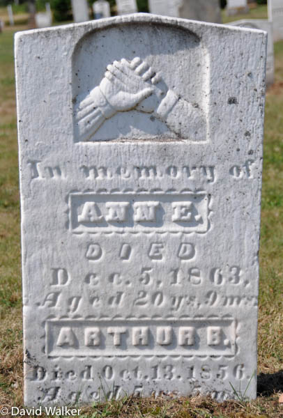 Inscription: In memory of / Ann E. / Died / Dec. 5, 1863, / Aged 20 yrs, 9 m's / Arthur B. / Died Oct. 13, 1856. / Aged 5 yrs. 5 m's.3,2  Tombstone, Ann E. Wright (1843-1863), her brother Arthur B. Wright (1851-1856). United Church Cemetery (Bedeque Cemetery), Lower Bedeque, Prince County, Prince Edward Island, Canada.