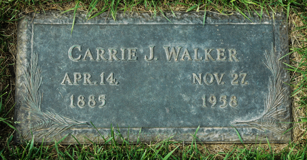 Inscription Front: Carrie J. Walker / April. 14. / 1885 | Nov. 27. / 1958.4,5  Cemetery Marker, Carrie Jean Walker (1885-1958). Fair Haven Memorial Gardens, Salisbury Road, Moncton, New Brunswick, Canada. Photo courtesy of Earle MacLean (findagrave.com).