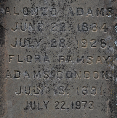 | Burial | He was buried in the Peoples Cemetery, Malpeque, Prince County, Prince Edward Island, Canada, 46.52968, -63.68771G. Inscription: In / Memory of / Donald Ramsay / Died / July 17, 1920 / Æt. 75 / At RestLeft: In / Memory of / Margaret Ellen / McGougan / Wife of / Donald Ramsay / Died / May 6, 1893 / Æt. 27 / Also Their Son / John Donald / Died Apr. 15, 1893 / Æt. 3 mos. & 5 dysBack: Alonzo Adams / June 22, 1884 / July 28, 1928 / Flora Ramsay / Adams Condon / July 13, 1891 / July 22, 1973 / RAMSAY.2 ![]() Tombstone, Donald Ramsay (1845-1920), his wife Margaret Ellen McGougan (1866-1893), their son John Donald (1893-1893), their daughter Flora (1891-1973), her husband Alonzo Adams (1884-1928). Peoples Cemetery, Malpeque, Prince County, Prince Edward Island, Canada. ![]() Front inscription detail. ![]() Left inscription detail. ![]() Back inscription detail. |